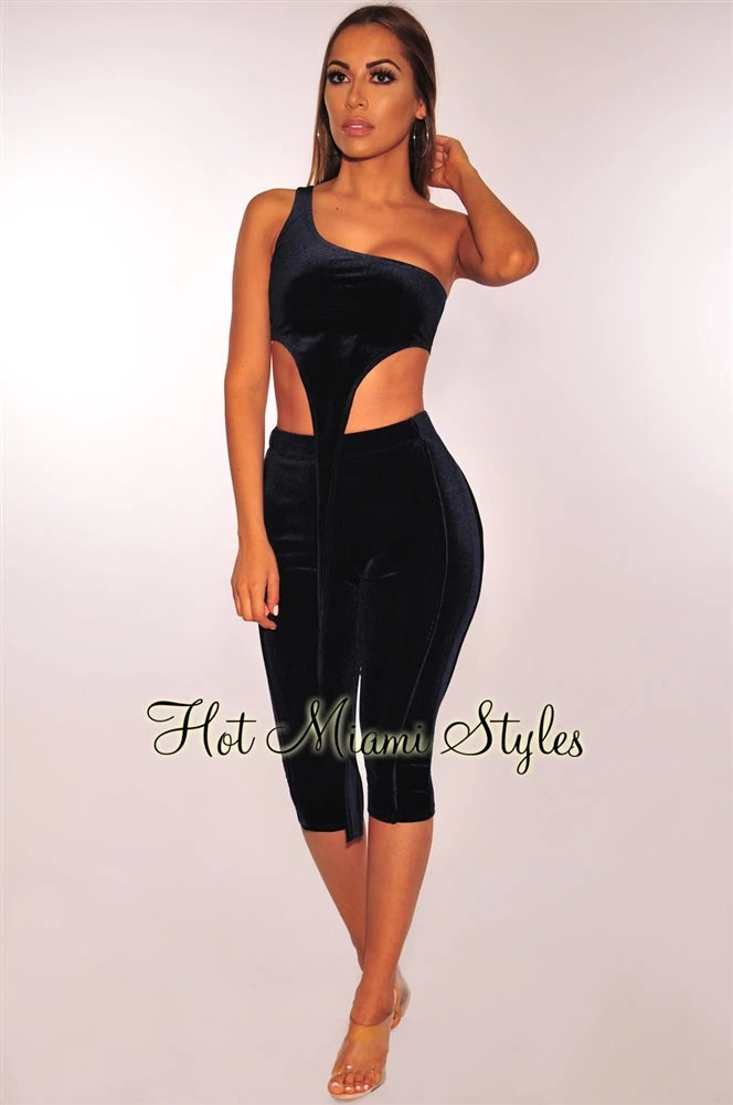 Earn major style points in this must-have midnight blue set. Made in ultra soft velvet and features a crop top with an extended strap and matching high waist capri pants.