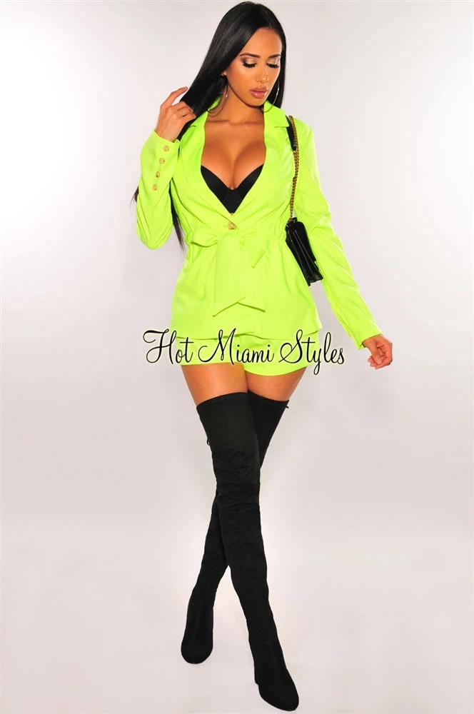 Be a #bossbabe in this chic neon lime coat set. Featuring high waist shorts and a matching coat with a belted design to snatch your waist.