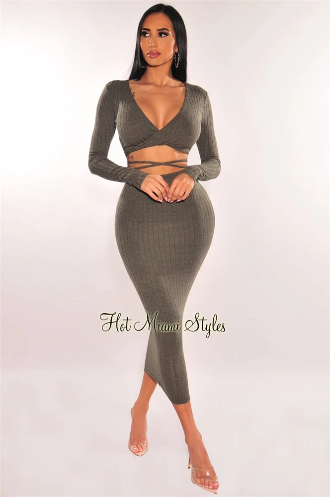 Sole Mio (set) Olive Ribbed Knit Wrap Around Skirt Two Piece Set