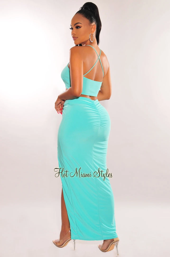 This two piece set is a must for the new season and beyond. Featuring a double lined bodice, cropped top and a matching knotted slit maxi skirt.