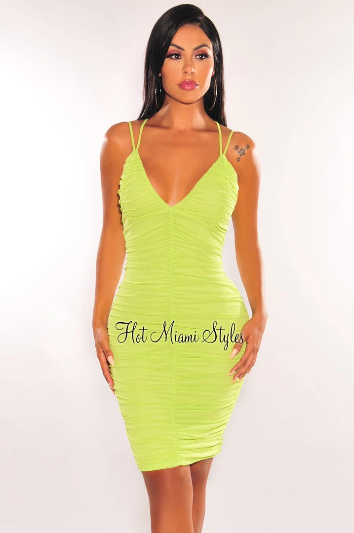 Dress up with our sexy bodycon ruched dress. Designed with a sexy V neck on a spaghetti strap mini dress, made with strategically placed ruching to enhance your looks.