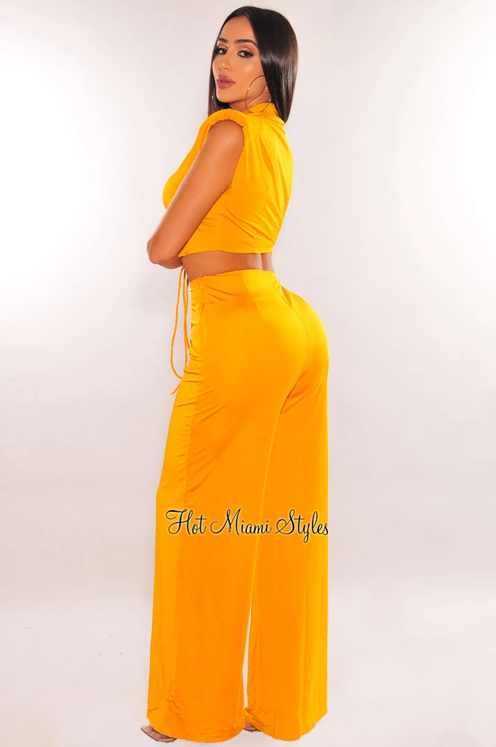 Keep your looks simply chic in this dijon two piece set. This duo is perfect to dress up or down with a dainty button up top and flowy wide leg palazzo pants.