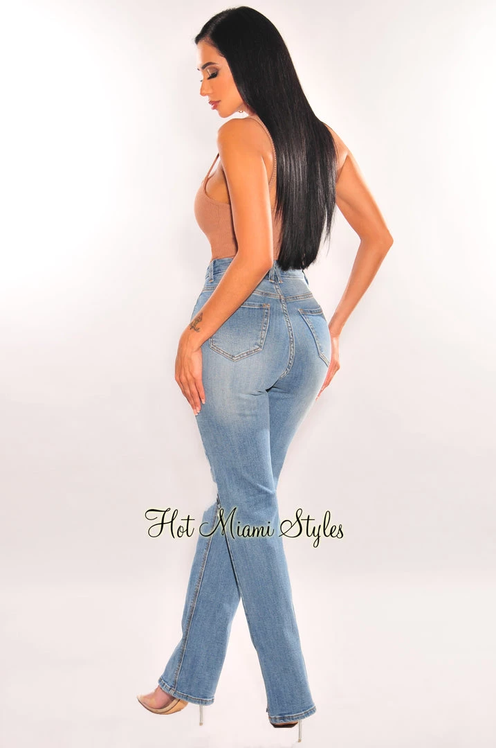 Show off your shape in these denim high waist jeans. Featuring distressed detail and stylish slit. Pair them with your favorite HMS bodysuit or cropped top.