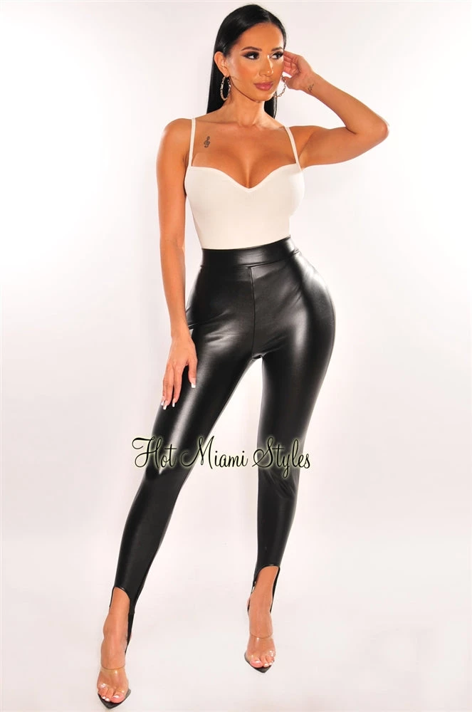 Channel ultra edgy vibes in these black faux high waist stirrup leather leggings. Made of ultra stretchy fabric to fit like a glove.
