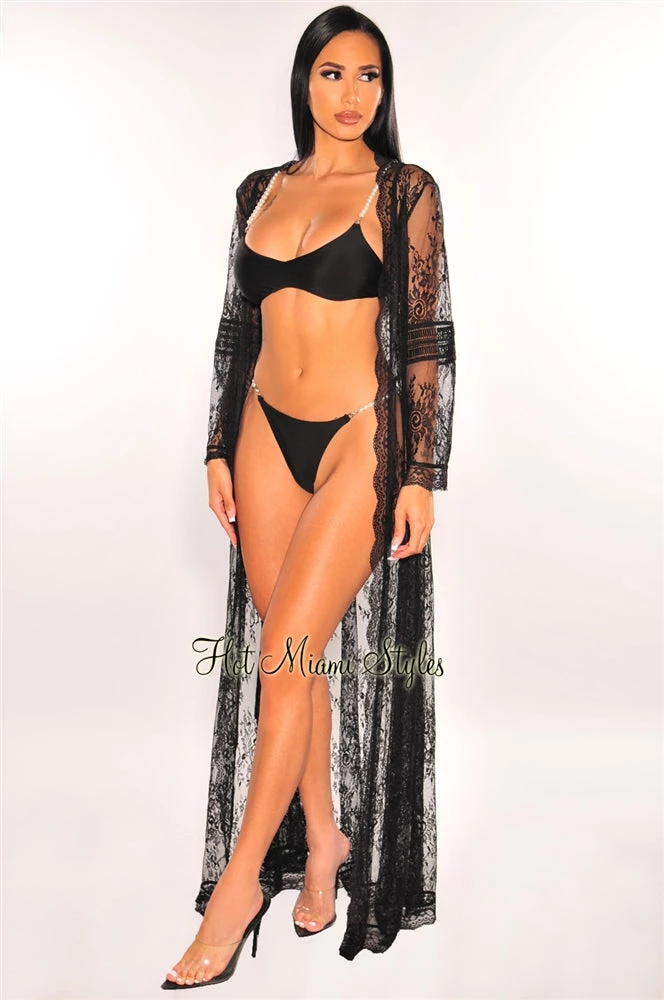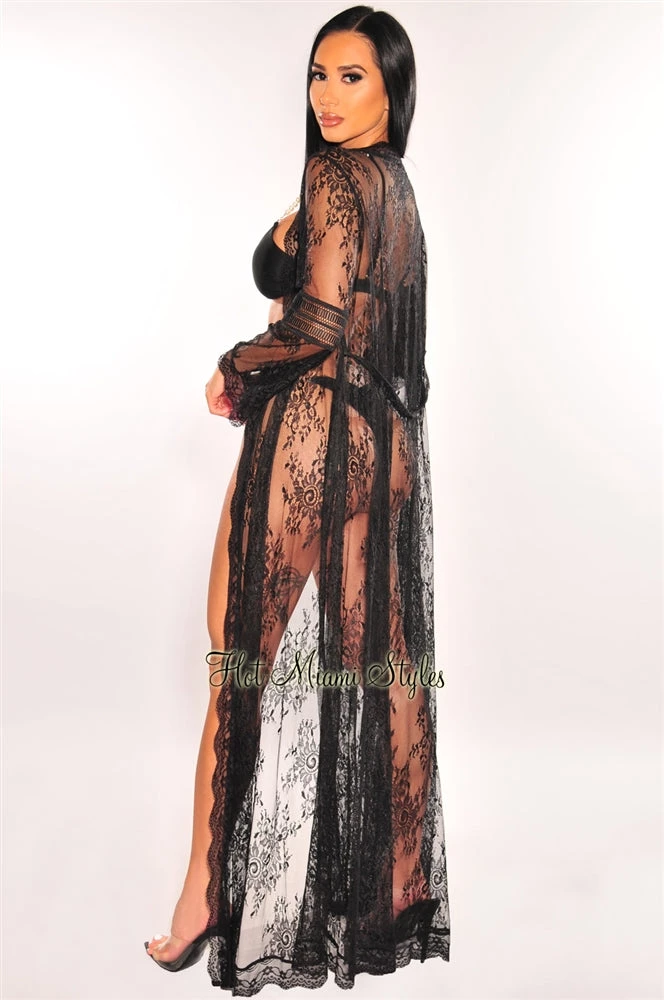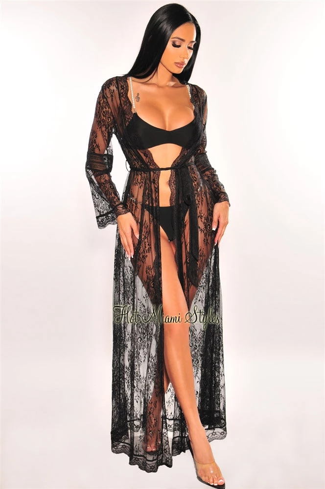 Vendor-unknown Black Floral Lace Crochet Sheer Tie Up Cover Up Just In