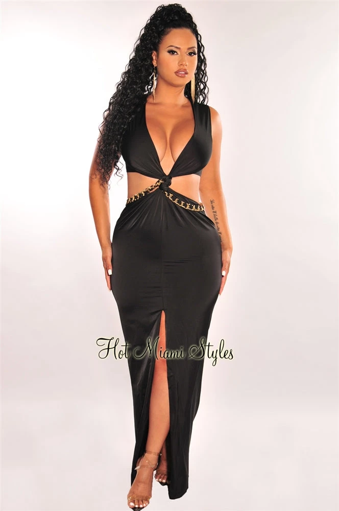 This black dream piece is all kinds of glamour. Features a chic knotted detail with an attached gold chain, with an appealing cut out on a sexy slit maxi dress.