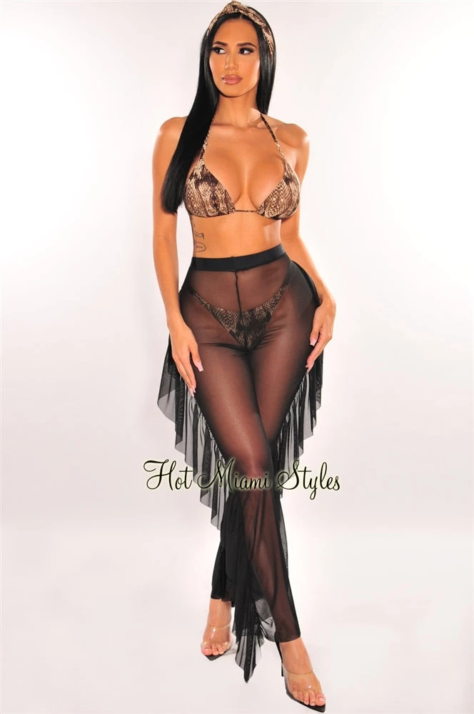 Vendor-unknown Black Mesh High Waist Ruffle Sides Pants Cover Up Pants