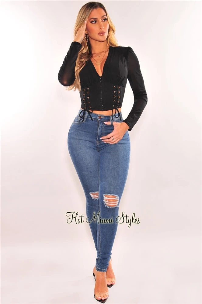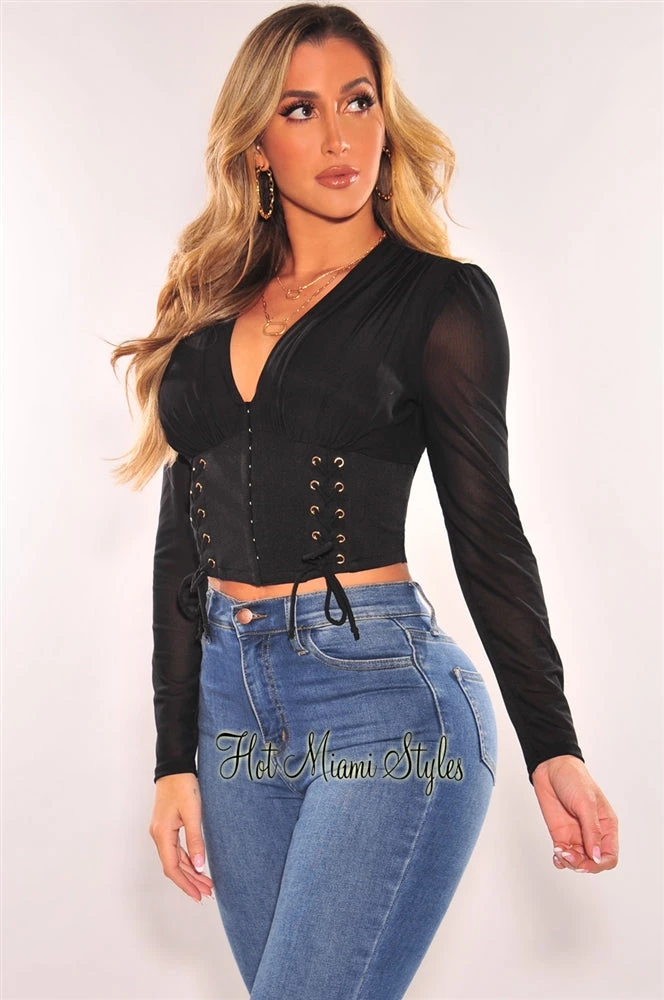 Yes babe, showcase sexy chic looks in this black corset crop top. Features a V neckline with hook & eye front closure and lace up details on a mesh padded shoulders long sleeves.