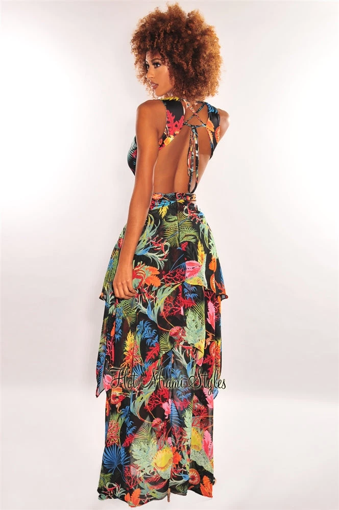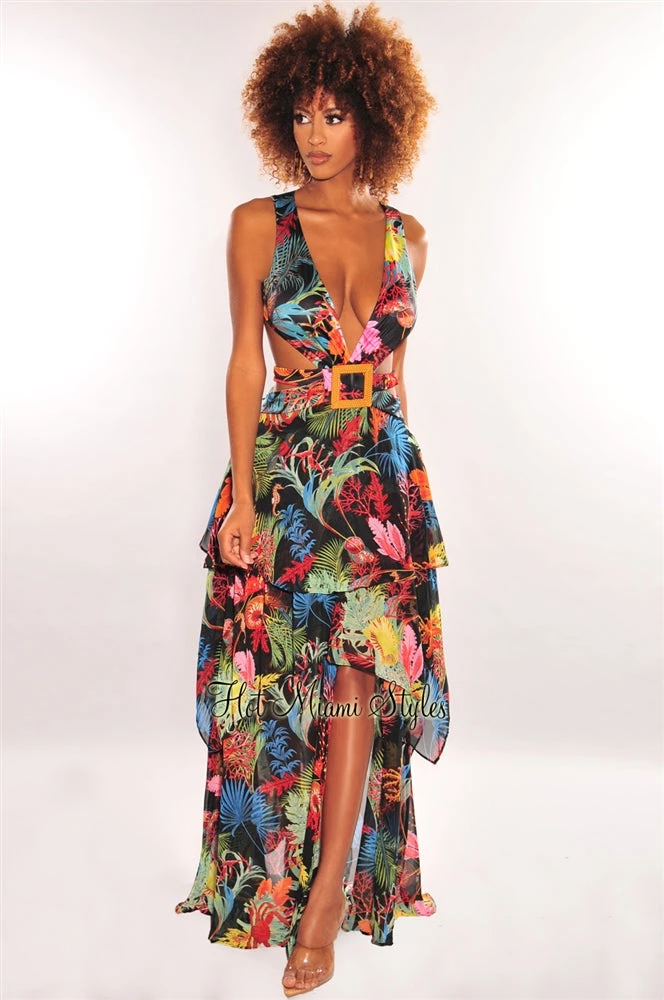 Staycay or vacay? This flirty cut out dress is everything you need. Features a wooden buckle on a belted waistband detail with a lace up open back on a fun corral reef print slit maxi dress.