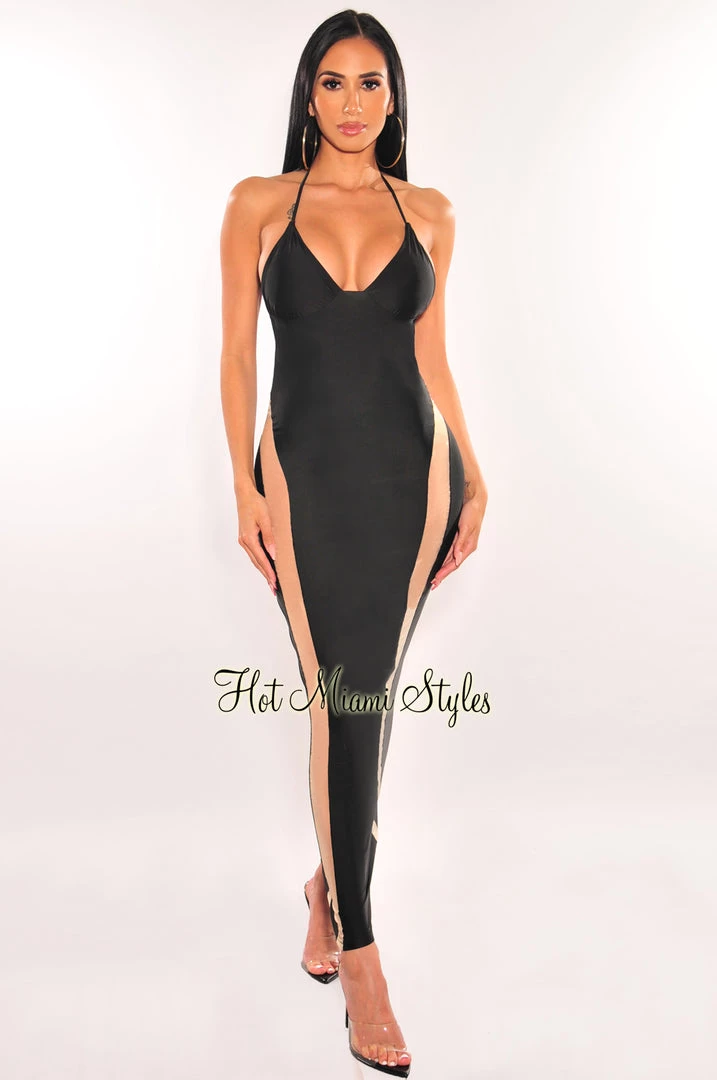 Designed to turn heads. Featuring nude illusion sheer details, halter style, v neck and curve hugging silhouette.