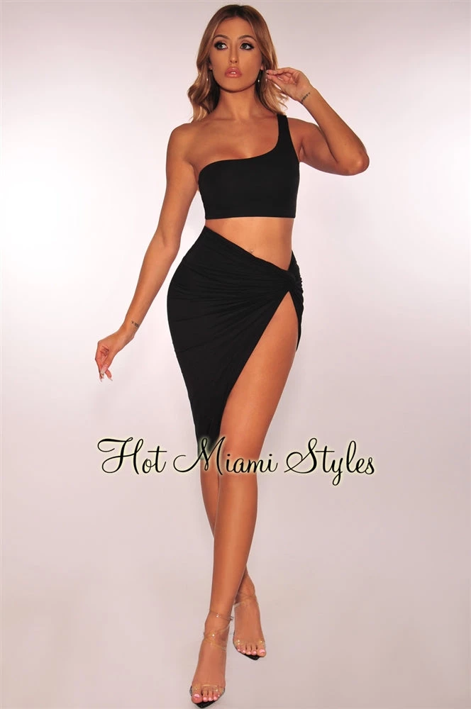 Slay and stand out anywhere you go in this black two piece set. Featuring a one shoulder neckline and a sexy matching knotted slit skirt.