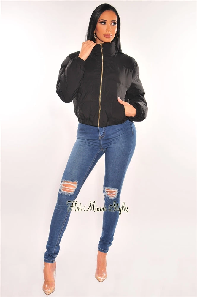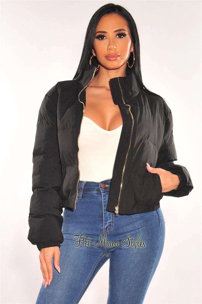 The perfect puffer bomber jacket for your favorite seasonal looks! Featuring a warm double layer puffy bodice on a zipper up jacket.