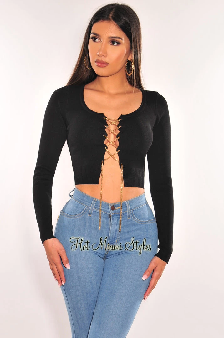 Deliver edgy chic style vibes with this black crop top. Featuring a ribbed bodice, long sleeveless and a lace up front with a stylish gold chain to complete the look.