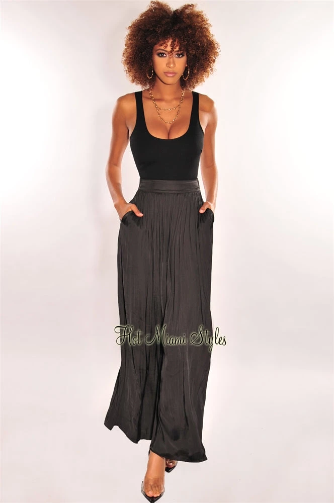 Reveal your inner chic with these black palazzo pants. Designed with a feminine pleated bodice on silky fabric, featuring a high waist wide leg fit.