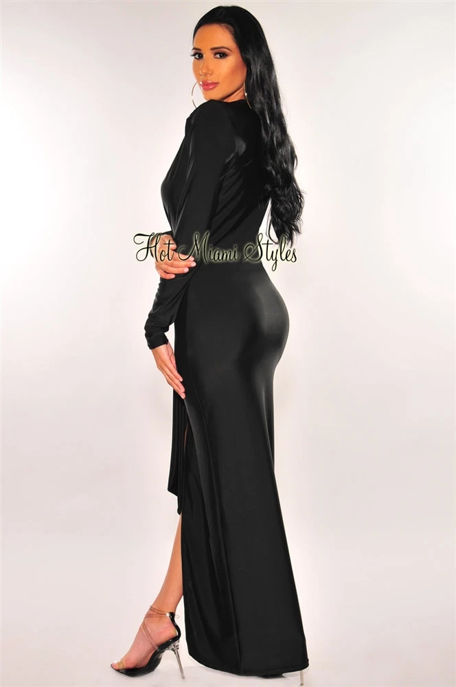 Wow them away when you wear this sultry maxi dress. Featuring a silky bodice, a sexy plunge neck with padded shoulders long sleeves, and a front slit detail on the perfect maxi silhouette.