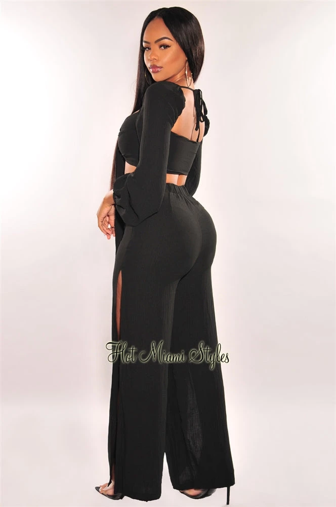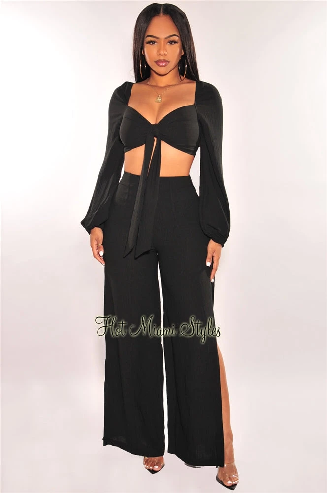 Upscale your looks with this stylish palazzo pant two piece set. Featuring a tie up long sleeve crop top with matching high waist pants designed with high slits to complete the look.