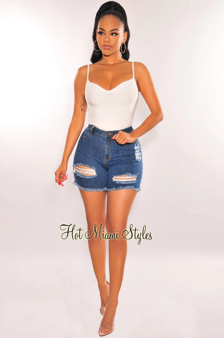 We are obsessing over these blue denim biker shorts. These high waist denim shorts features distressed details with a frayed hem and a stretchy denim fit.