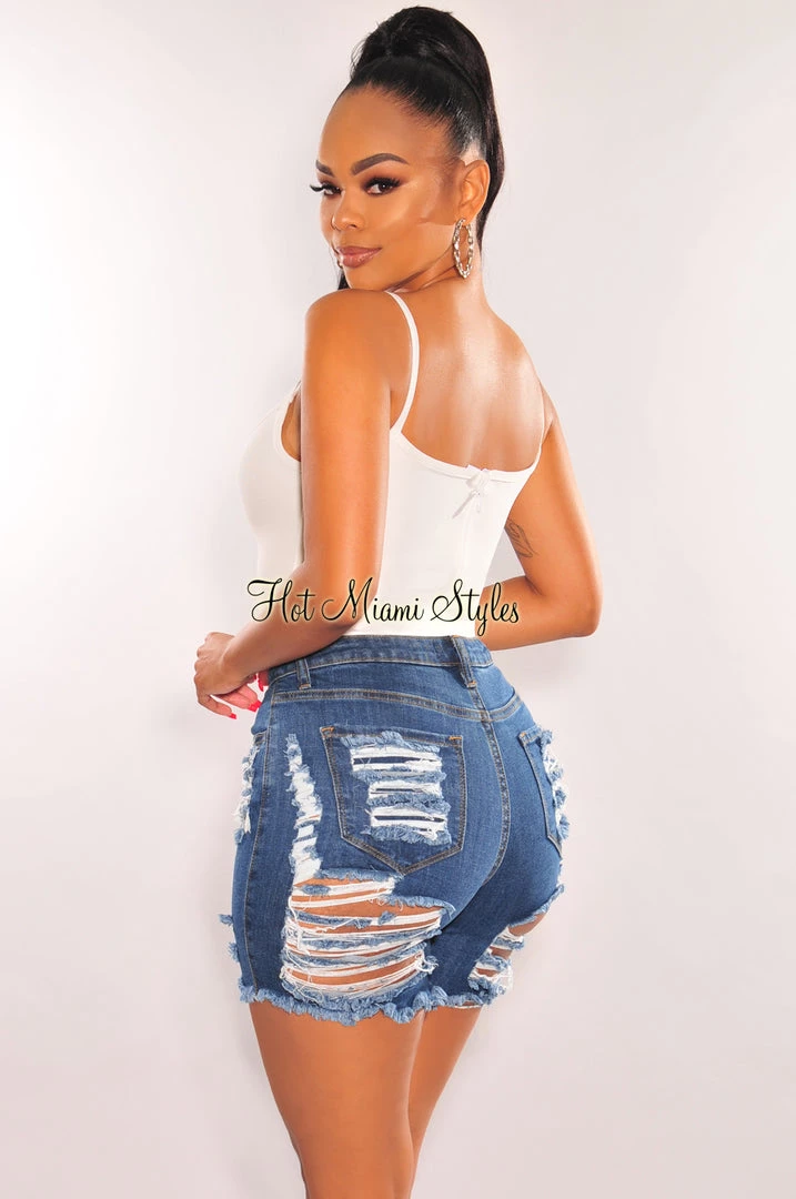 Vendor-unknown Blue Denim Destroyed Frayed Hem Biker Shorts