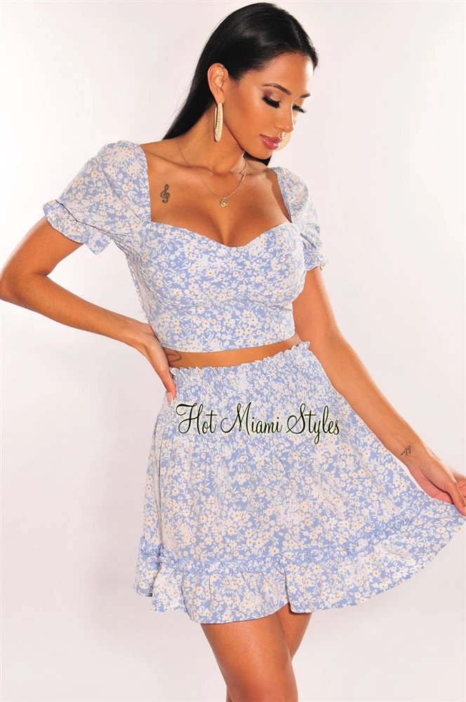 Feel like a vacay when you slip into this cute skirt two piece set. Made with a floral print bodice on a padded bust top and a matching high waist skirt with smocked details to snatch you.