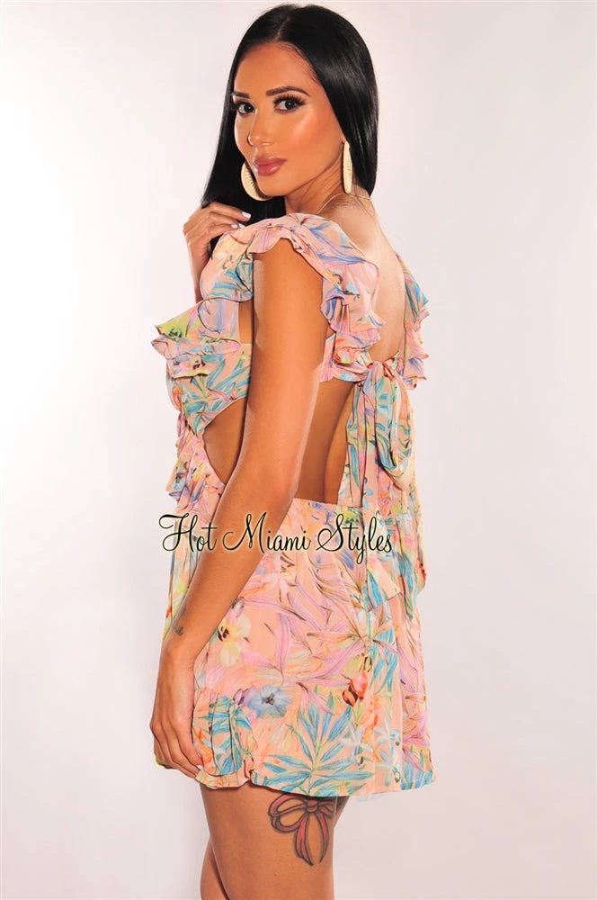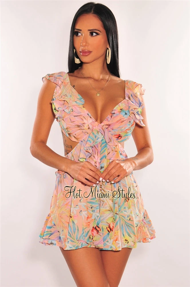Deliver all the flirty vibes in this floral palm print romper. Designed with a sexy cut out back with a tie up and ruffle details on a deep v neck design.