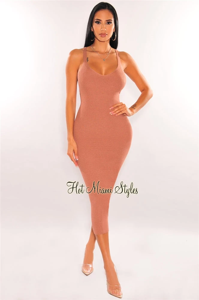 Slip right in this slim bodycon midi dress. Made of stretchy ribbed knit fabric that will hug and shape your body on a tank style dress.