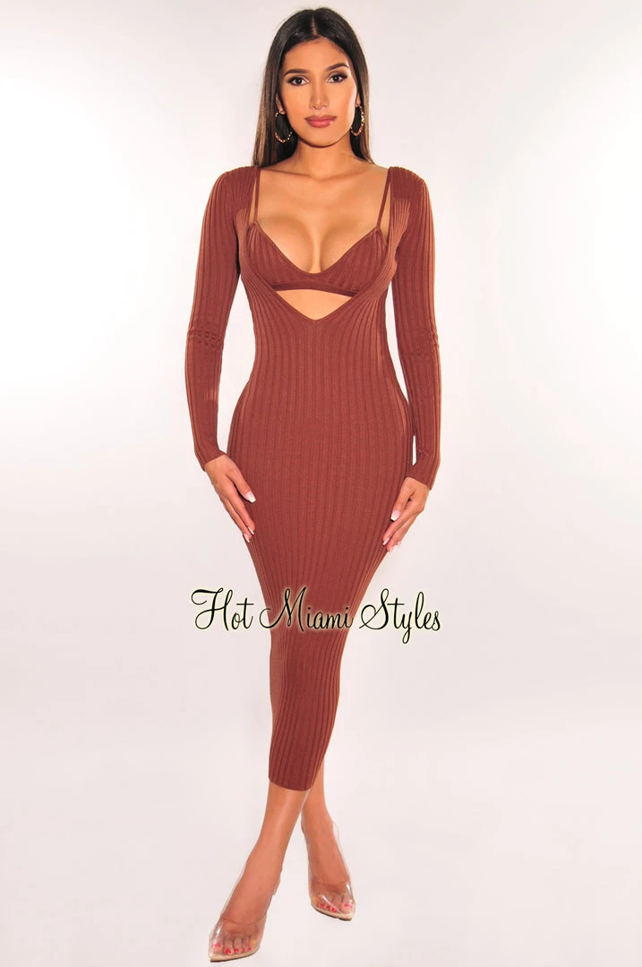 Vendor-unknown Chocolate Ribbed Knit Plunge Neck Long Sleeve Midi Dress + Bralette Just In