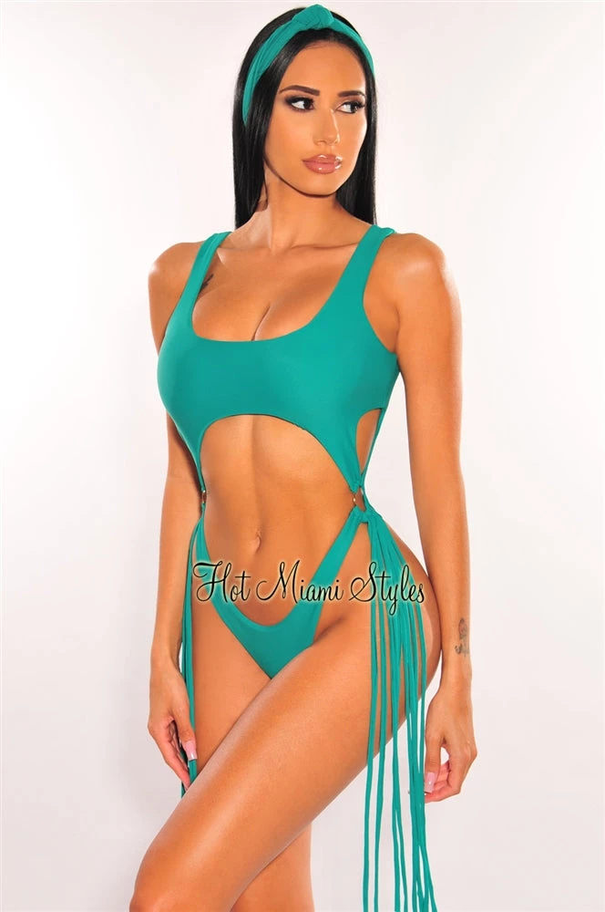Deliver the hottest looks in our stylish cut out swimsuit. Designed with a super sexy high cut detailed with O-Rings and flirty fringe at sides. Paired up with a matching headband.