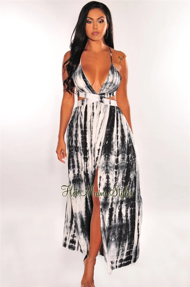 Leave them speechless in our beautiful maxi dress. Designed with a fun tie dye print on a v neckline with a sultry cut out on a crisscross back and sexy thigh high double slits.