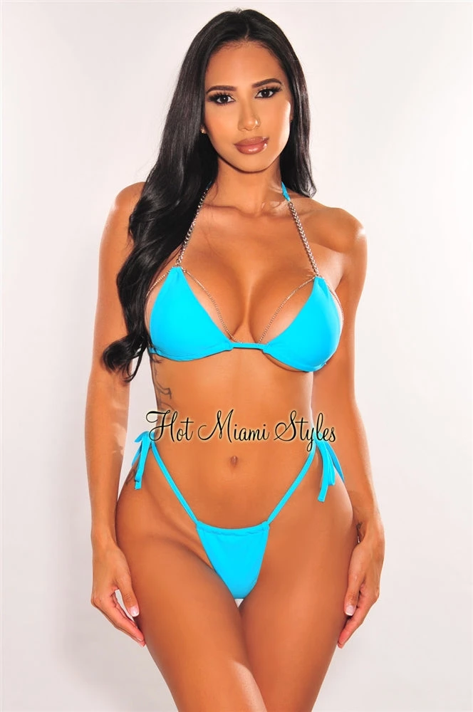 Say hello to your new fave two piece bikini. Features silver chain details on a padded bust and a high cut tie up sides thong bottom for that Hot Miami Style.