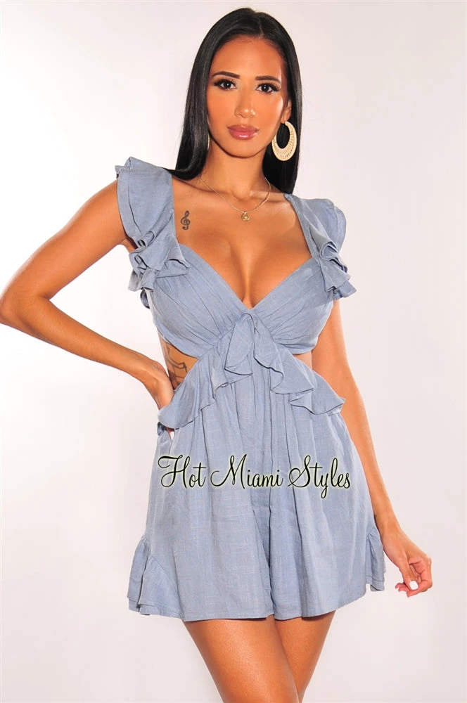 Yes babe, this is the perfect outfit you’re looking for! This cute romper is full of life with ruffle details and a sexy cut out. Featuring a tie-up back and a gorgeous mini dress silhouette.