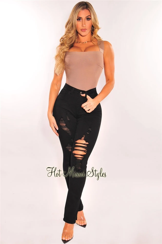 These pair of black denim jeans are a must-have! These fitted jeans feature a high waist and a stylish distressed detail leg, featuring a slit at hem for an upscale look.