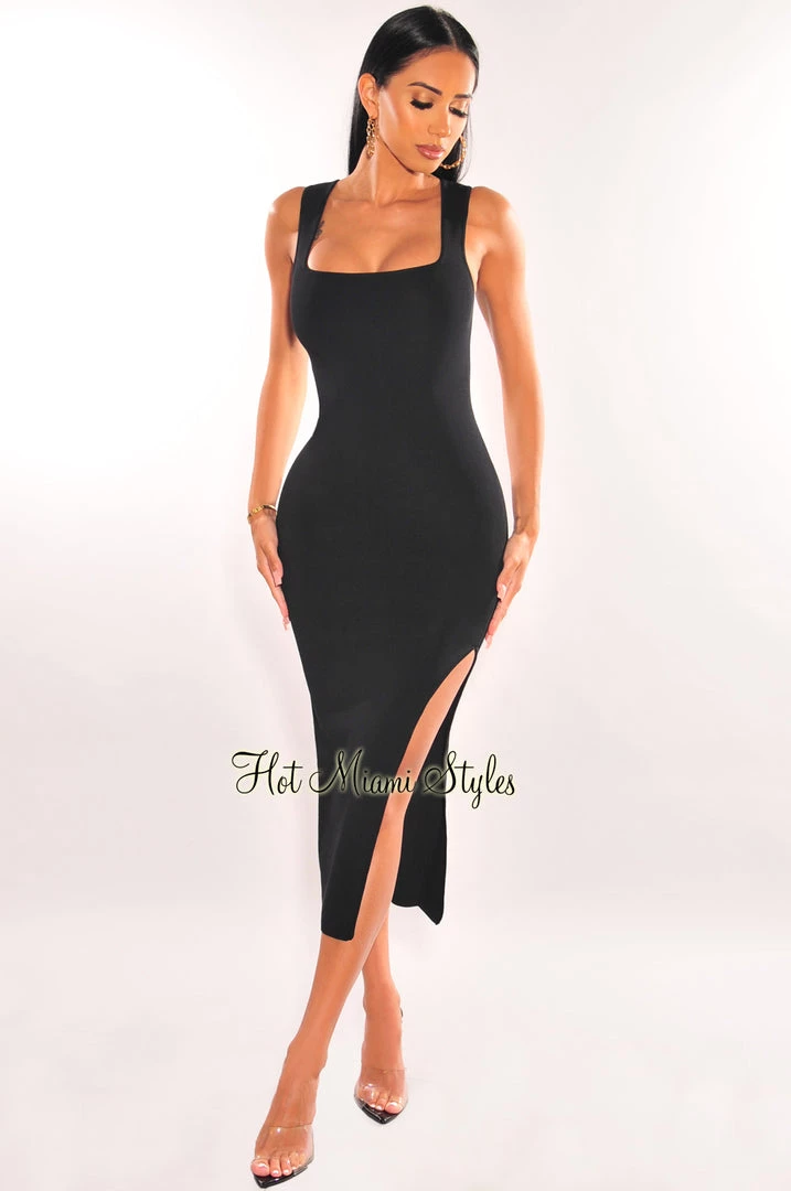 Get the perfect look when you wear this black sleeveless slit dress. Features a stretchy ribbed fabric with square neck on a sultry length.Â