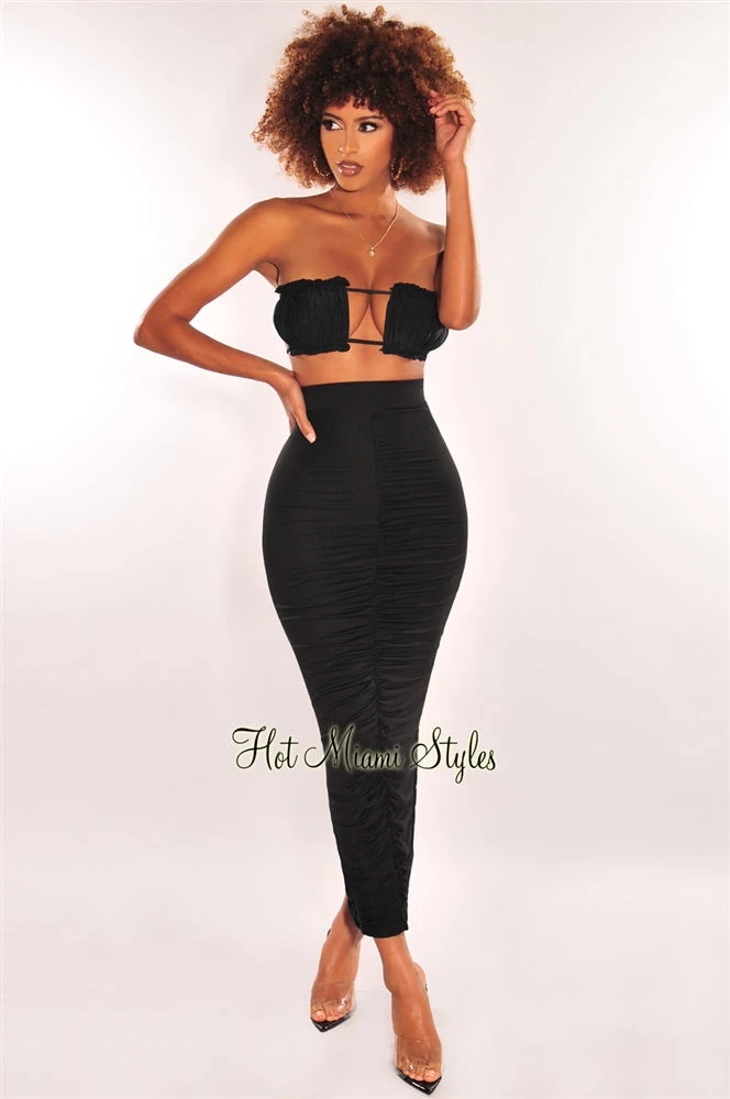 Get that sexy bodycon look in this ruched skirt. Features a high waist on a maxi length with an appealing back vent slit.
