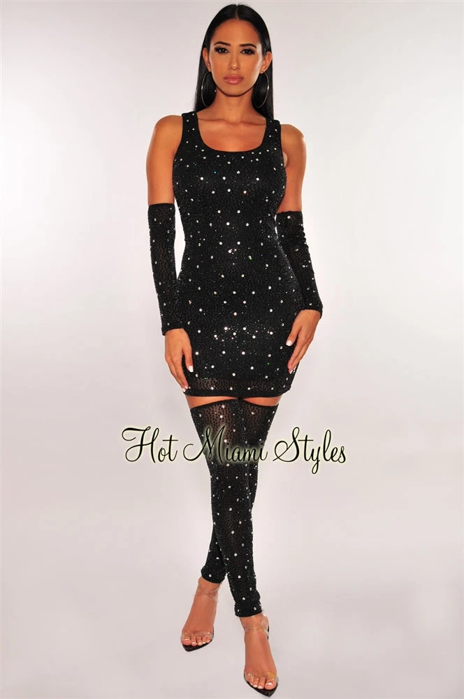 Not your basic.. get ready to turn heads as you slay and shine in our HMS exclusive black studded set. Features gorgeous silver rhinestones, matching stockings and gloves to create a show-stopping look.