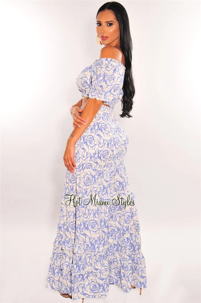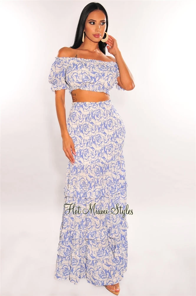 Babe, this outfit is perfect for that summer get away! This gorgeous two piece set features an off shoulder crop top with a beautiful matching smocked detailed ruffle maxi skirt.