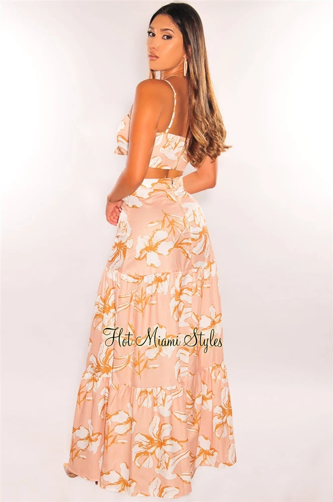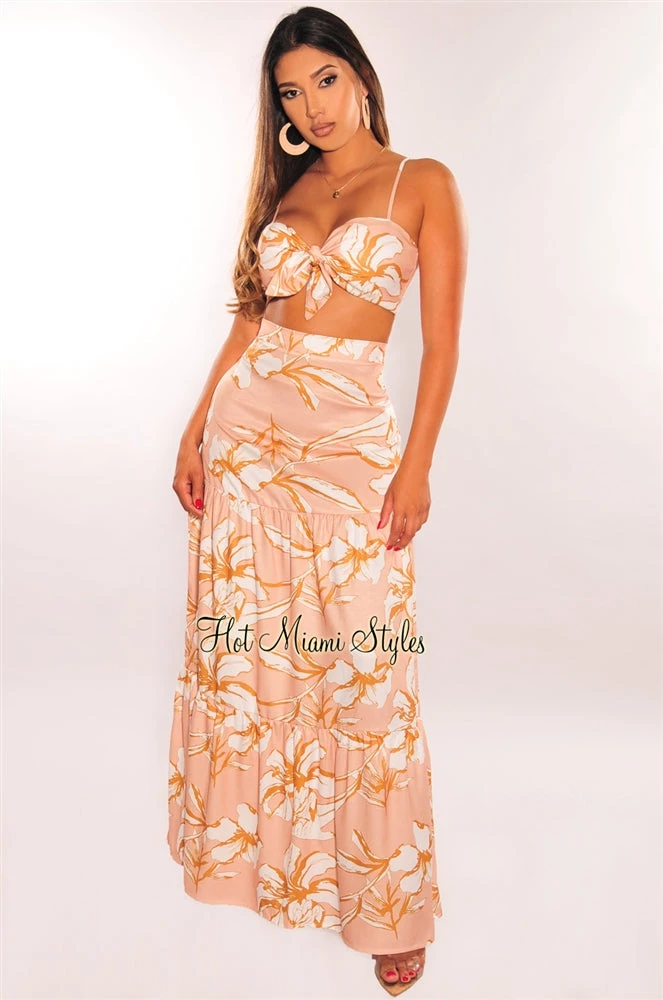 This outfit is perfect for that staycation! This two piece set features an eye-catching floral print on a beautiful two piece set. Featuring a tie up detail on a padded top and matching chic high waist ruffle maxi skirt.