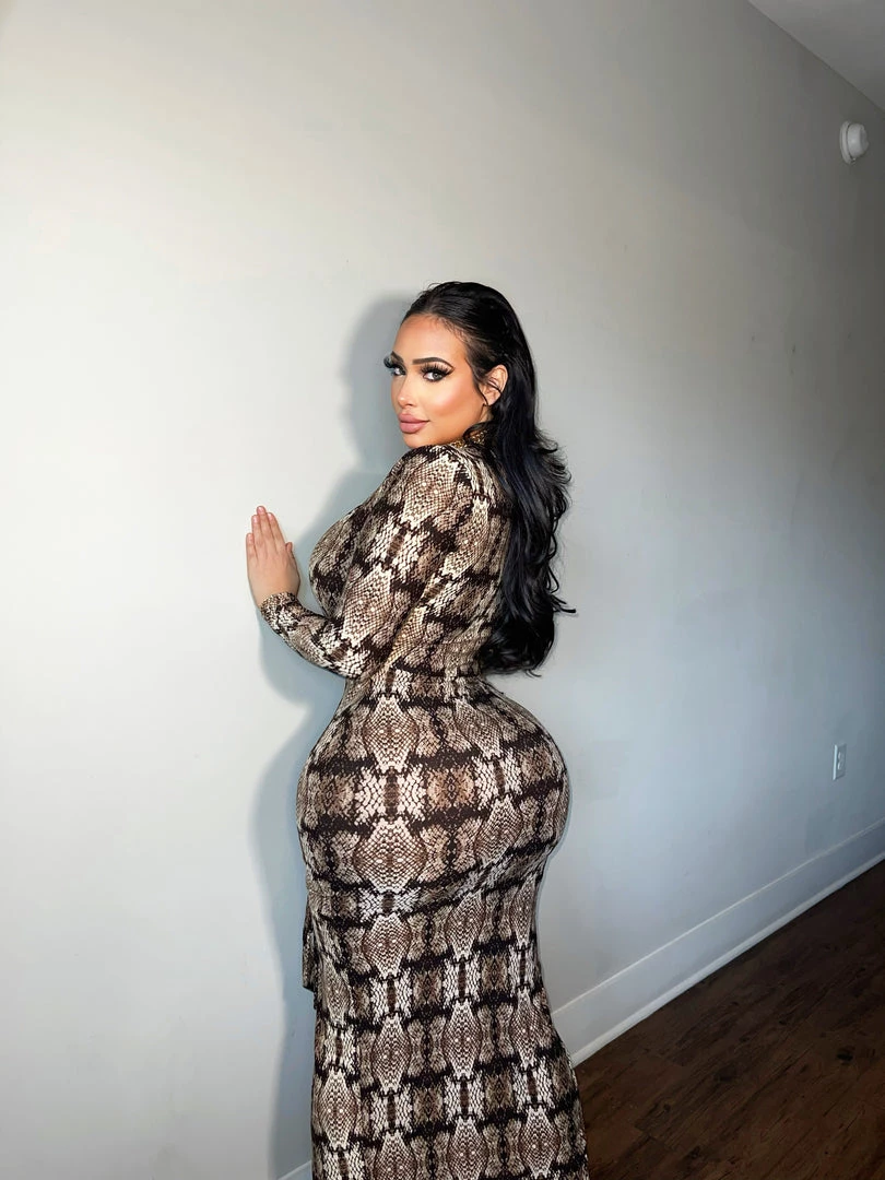 Wow them away when you wear this sultry maxi dress. Featuring a snake print, a sexy plunge neck with padded shoulders long sleeves, and a front slit detail on the perfect maxi silhouette.