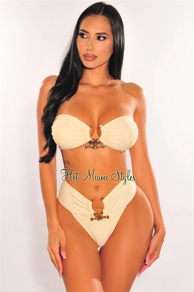 Get all the looks when you wear this super cute two piece set bikini. Made with silky fabric on a padded bandeau top, featuring a gold ring detail on both top and bottom to complete the look.