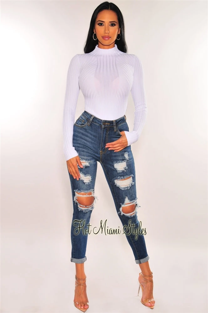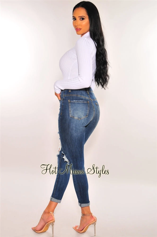 This pair of dark denim skinny jeans goes perfect with any of your favorite top! Featuring distressed legs designs, a high waist, and stretchy denim fabric.