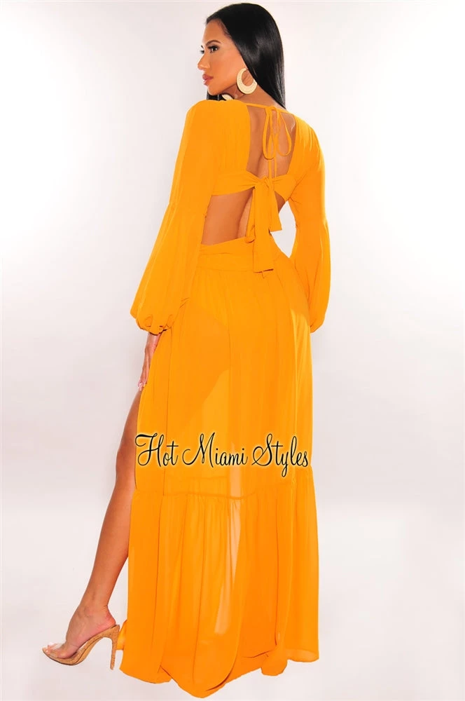 This dress is everything you need for the season. Made with a mesh bodice with a tie up open back design and long sleeves. Featuring a wood belted detail on a double slit maxi dress silhouette.