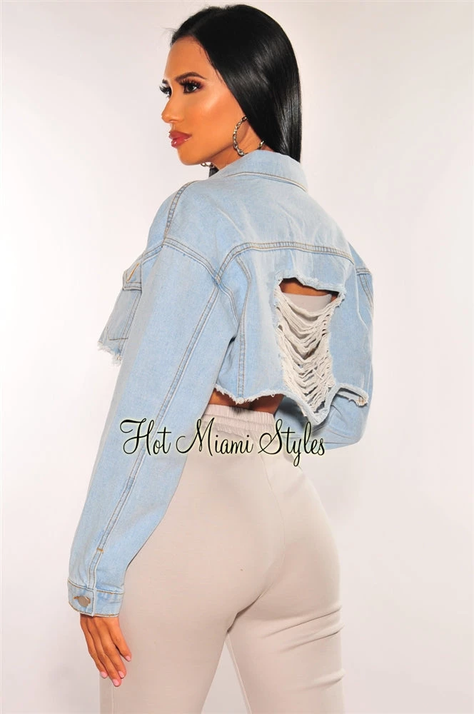 A total must-have chic essential! This denim jacket will amp up any look, Featuring a collared neckline with a destroyed detail on back on a cropped jacket silhouette.