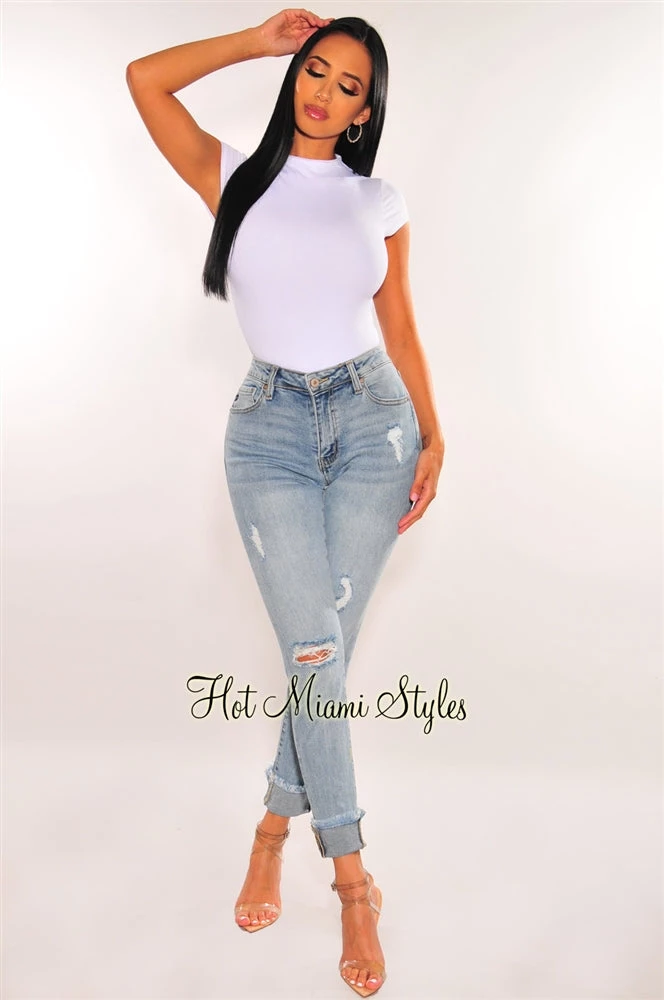 Denim is a must have, Amp up your collection with these light denim wash pair of jeans. Featuring a high waist rise, distressed legs details and a frayed hem with optional cuff.
