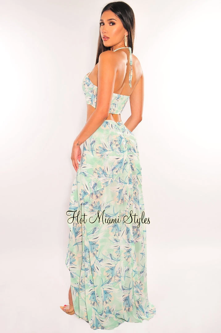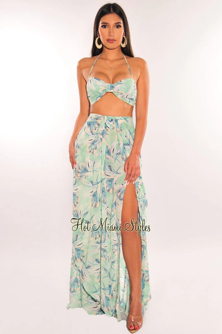 Vendor-unknown Just In Mint Floral Print Halter Slit Layered Maxi Skirt Two Piece Set