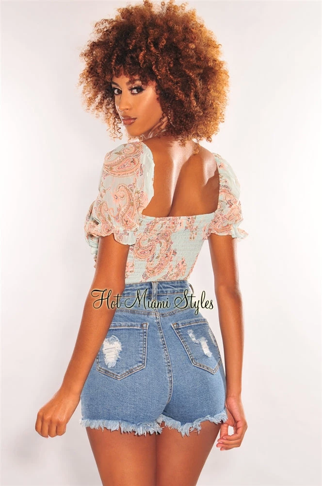 Deliver groovy looks in our mint paisley print crop top. Made with a lined mesh bodice, featuring a padded bust with short sleeves and smocked back.