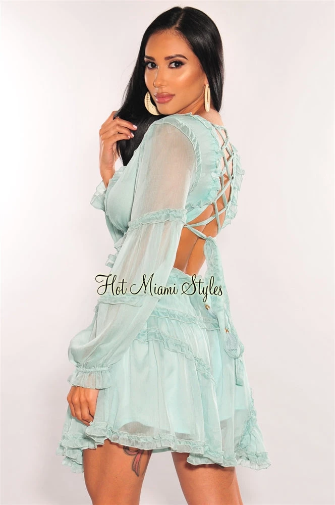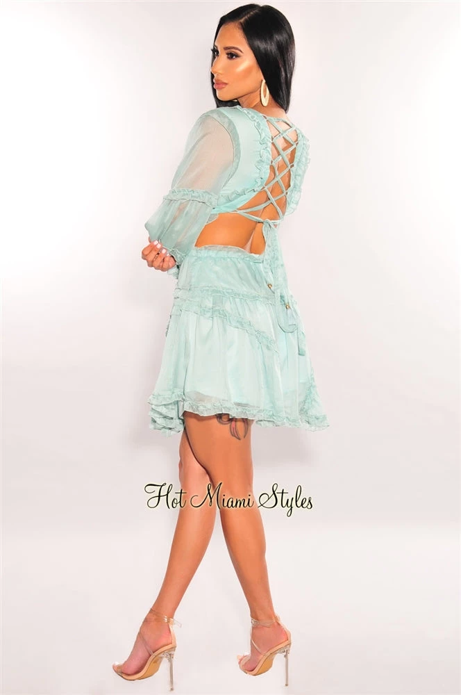 Vendor-unknown Just In Mint Ruffle Cut Out Lace Up Long Sleeves Dress