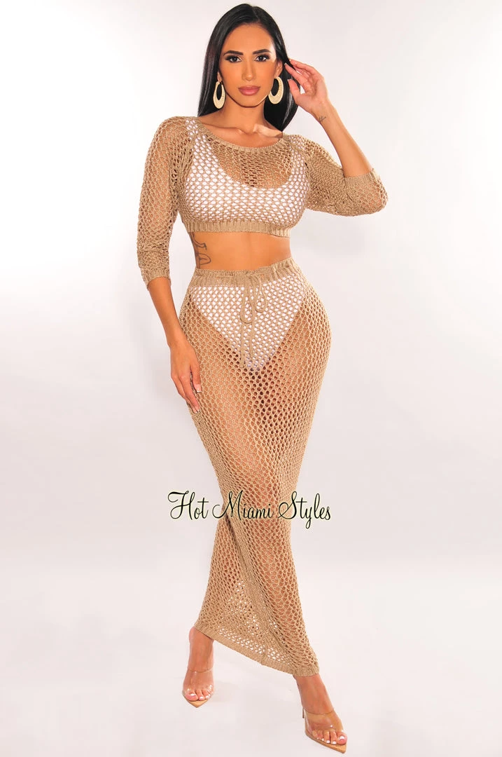 Be on trend this season in this crochet cover up set. Designed with a long sleeve crop top and chic matching skirt perfect to show off your favorite HMS bikini.