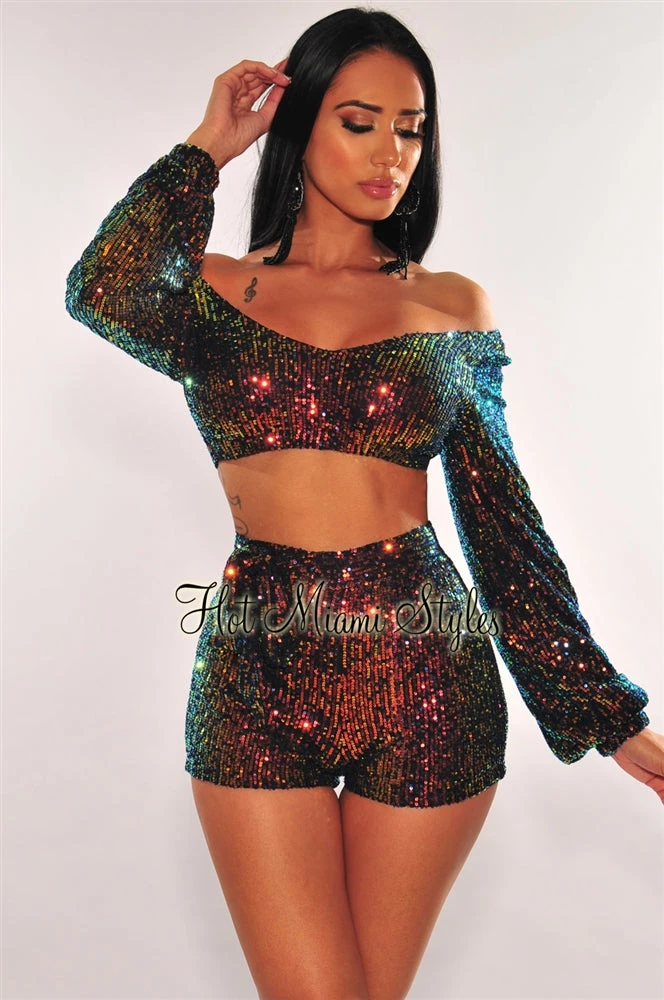 Keep shining everywhere you go with this rainbow sequins two piece set. Featuring a long sleeves crop top and belted matching shorts.