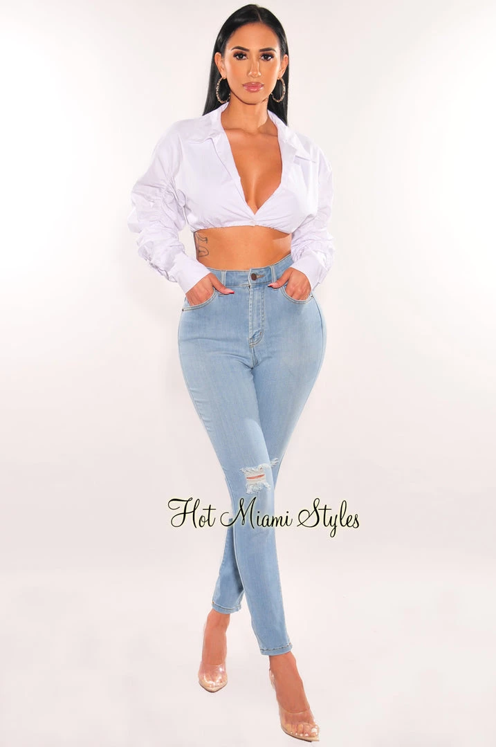 Deliver super cute chic looks with this long sleeves crop top. Featuring an eye catching ruched detail on sleeves on an appealing collared v neck crop top design.