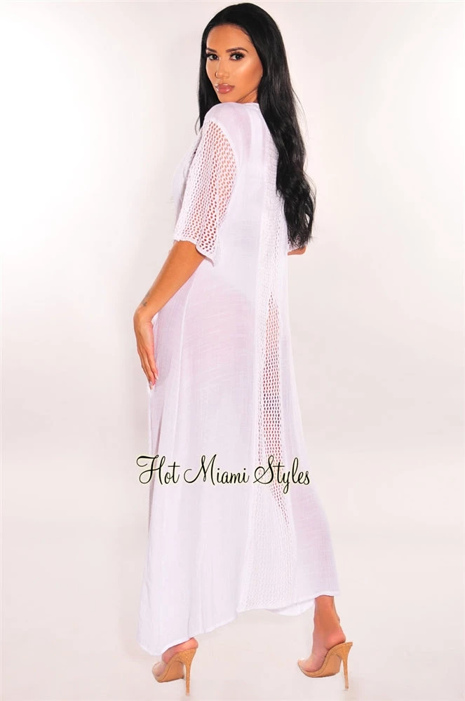 The perfect layering piece for all the swimwear looks, this tie up cover up is everything we are currently loving with a maxi length and a beautiful crochet detailed design.