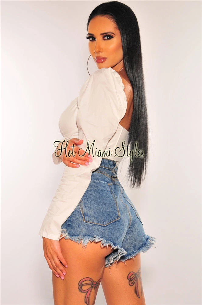 Deliver chic classy looks in our white O-ring zipper crop top. Featuring a bustier style neckline, with boning all over to form your waist made with a front zipper closure and puffy long sleeves.